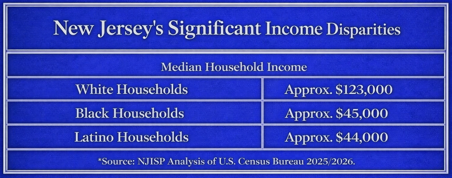 Significant income disparities persist across racial and ethnic groups in New Jersey. Data from NJISP and the U.S. Census Bureau (2025/2026) shows that White households earn a substantially higher median income, approximately $120,000+, while Black and Latino households earn less than half that amount on average.